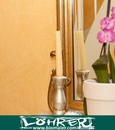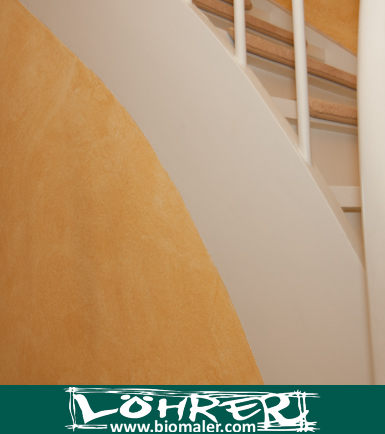 Die Auftraggeber wünschten einen repräsentativen, aber auch robusten Eingangsbereich, der eine schlichte Eleganz ausstrahlen sollte. Zunächst wurde die Beleuchtungssituation vollständig geändert. Die Wand-und Deckenanschlüsse waren teilweise eckig, teilweise bestanden sie aus Hohlkehlen. Um die Anschlüsse einheitlich zu gestalten, wurden Beleuchtungssystemleisten aus Hartschaum verbaut, die den Vorteil haben, dass Halogenstrahler oder LEDs problemlos eingebaut werden können. Auf den Wänden wurde ein mittelgrober Streichputz verarbeitet, der nach Austrocknung mit einer Wachslasur versehen wurde. Die weiße Holztreppe fügt sich harmonisch in das Bild ein.